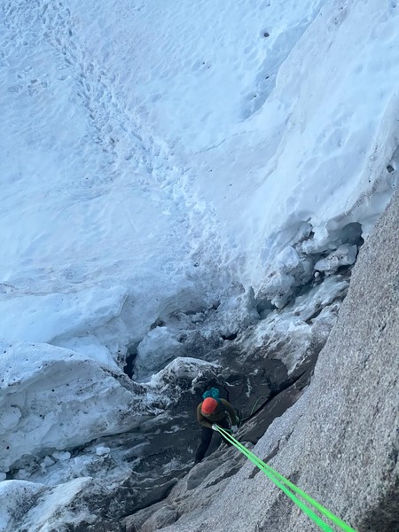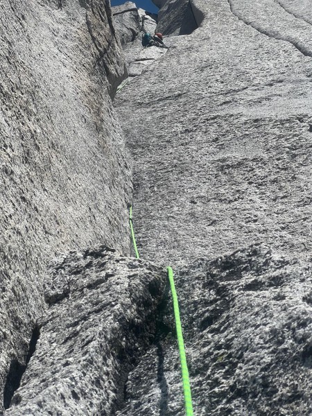 The crazy thing about this climb is all the pitches are quite long, mostly between 50-60m. I am often used to climbing 35-40m pitches on long climbs. I think we belayed a bit early on some of the pitches so some of the landmarks didn’t make sense, but I don’t think we ended up having to do any extra pitches since we were able to make it up on the scree ledge after the amazing corner. It was stellar corner crack climbing for about 60 meters. The pitch was mostly normal to wide hand jams on impeccable granite. I got into one of the best flows I ever had while climbing. The only interruption was the occasional bulge in the corner. As the rope ran out, I found a good ledge and belayed Kyle up as I relished in the glory of that crack. Kyle linked the scree ledge pitch and the next chimney pitch, a good bit of rest from the rest of the climb. Next was a really fun 5.8 pitch with two different crack systems. This was easy to follow from the beta and included a really fun double crack / bear hug system at the end. This brought us to the upper bivy ledge where we ran into Max, Colin, and Red. They were quite the characters. We would continue to run into for the rest of our trip. They had spent the night at that ledge and were just getting started around noon. The leader was gone by the time I got there but we could see that the followers had giant packs and didn’t envy them for that. As they set off, red asked me to double-check his eight knot. This question worried me as we were going to have to follow them for the next 5 pitches to the top of the climb. As they ascended the pitch (the other 10- crux pitch) there was a lot of profanity as they climbed with the giant packs.