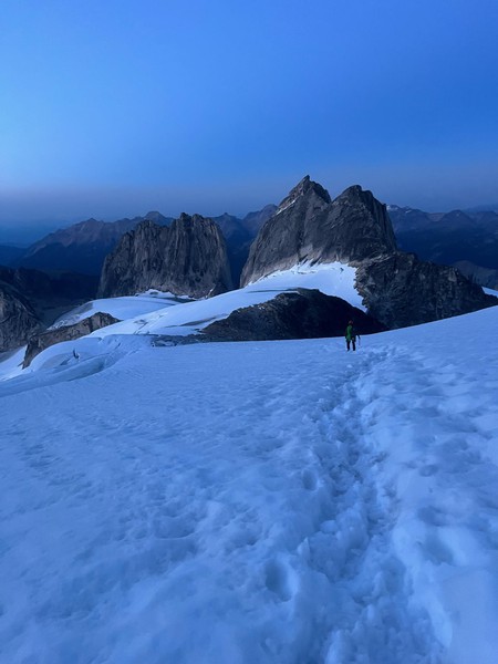 There was one where we thought we might be able to scramble, and there was this ratty old hand line, but we weren’t able to get all the way down to the rappel anchor, so we had to go back up and do it. I eventually set up the rappel and rappelled down to the next anchor, which was fine. It just ate a little bit of time. We were worried about the ropes getting stuck on the blocky easy terrain, this wouldn’t have been too bad to climb back up, so in retrospect, we should’ve just rappelled in the first place. The next couple of rappels were pretty uneventful, maybe just a little hard to spot the anchors. The last rappel was the most “surprising” as Alex put it, you rappel directly into a Bergschrund. Luckily you can just walk right out of it. The scariest part was the hanging ice that was somehow still clinging to the rock. The foreshortening effect on the descent and the glacier made it look more serious than it was, the glacier was not steep, and we didn’t even need crampons at that point. At that point, it was 9:30 pm and still light out and we headed toward the Pigeon-Howser col. Once past the col, the worst part of the descent began. The steepest part of the col back to East Creek Camp began with this very loose recently post-glacial scree and talus, there was no good way through. I wish there had been steep snow. After getting through that we got back onto another glacier, which we had traveled on before. There was some steep snow that was easy to downclimb without crampons and we kind of gambled on walking on the ice without crampons since we had at least done it before. But it had firmed up at night so we needed to put crampons back on and it was a little harrowing. I kind of slipped and had to self-arrest which was maybe one of the first times I had to do that. But eventually, we got crampons on and then getting back to camp was pretty uneventful. From there it was just tiring because we had been out for 18 hours camp to camp.