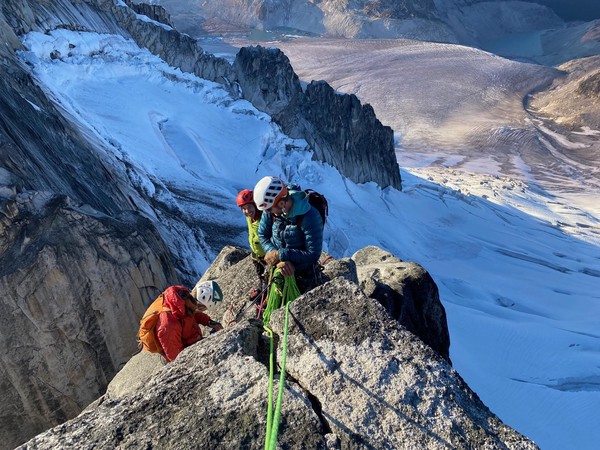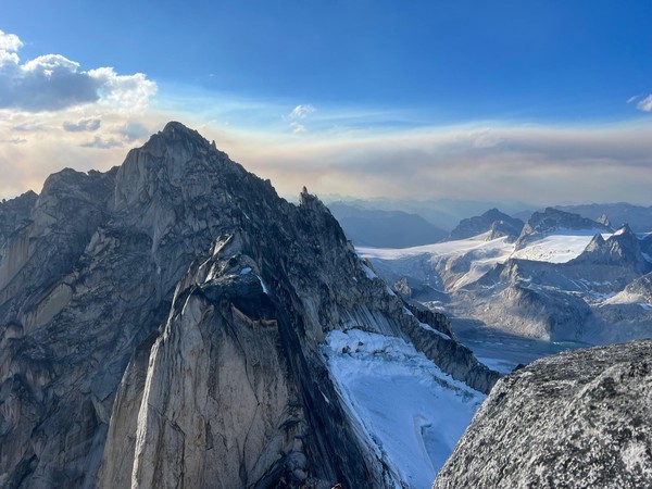 Before long we were at the summit, It was an amazing summit, you could see all the towers and the bugaboos. It was such a sheer summit, and it was nice to be done with the up. While we were setting up our rappels, we saw some folks topping out on the summit and it turns out it was Alex Honnold and Tommy Caldwell, having just completed a linkup of the three Howser towers. They had a drone flying above them, circling the summit. That detracted a little bit from the experience as drones don’t have a place in the wilderness in my opinion.