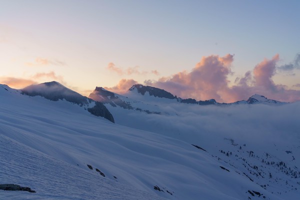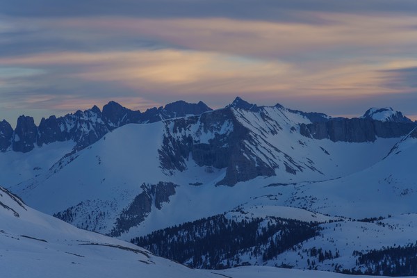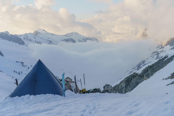 We had hoped to make it to the base of milestone pass, but looking over from the top of coppermine pass we saw across the valley to triple divide pass, said nope, ripped skins, jumped over a small bergschrund in the snow, on a skied over a mile without taking a single turn to find our next camp overlooking cloud canyon. This campsite was perhaps the best of the whole trip. It had it all, running water, protection from the wind, and stellar views. We made dinner as the sun set and then went to bed.