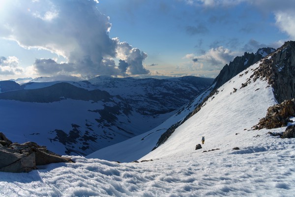 The next morning we headed for pterodactyl pass. This involved, what would become the primary mode of transport, side-hilling. We began to become accustom to the the dilemma between taking the direct path losing and re-gaining elevation or trying to contour around the bowl to keep the elevation but instead have to spend the whole time on edges, these micro navigational choices really added up.