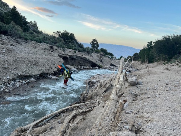 It was about 7pm and we made it to the last crux of the route, all the creek crossings. We had talked to our friends who had done the creek crossings a few days ago, they seemed pretty nonplused about them, so we weren’t worried. They were crossing at the best time of the day and we were crossing at the worst time. We deliberated between camping another night and waiting until the morning or just fording the creeks. I really wanted some warm food and a beer so we went for it. The trail crossed the river 3 times, so once we did one we were pretty committed. The first crossing was probably the deepest, most of the way up my thighs. While I was crossing I dislodged a couple rocks and the current threw what seemed like soccer-ball sized boulders quite far. By far the strongest creek I’ve crossed. We made one route finding mistake and ending up having to cross two extra times for a total of five.