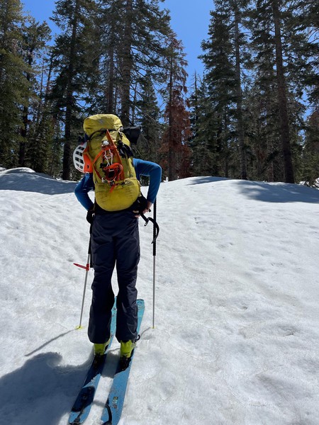 Finally, on our e-bikes going up the hill we ascended from the oak chaparral into the giant sequoias, and finally to the snow. We were able to transition from bikes to skinning immediately. Happy to not need to carry our skis on a our back we skinned out of the dense forest (the snow at the beginning was more pine-needle than snow). The skinning was quite uneventful until we neared the pear lake hut, at which point it had become so sloppy that our skins barely held onto our skis, Glob Stopper be damned.