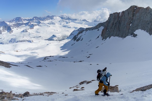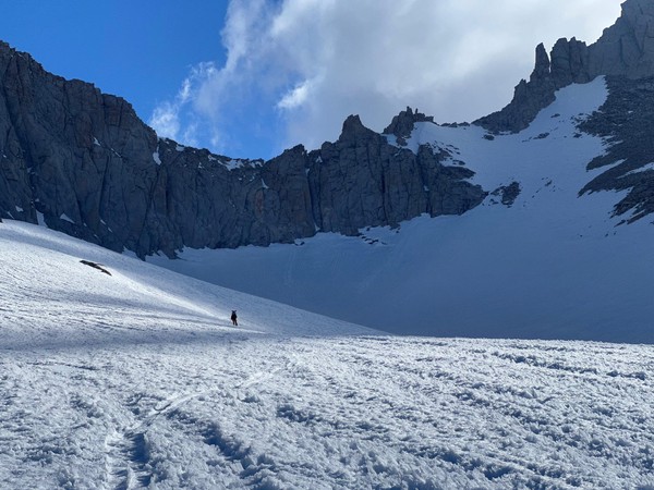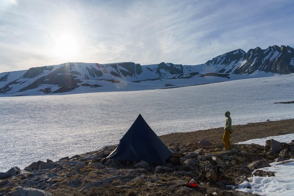 This day was pretty uneventful as it was mostly a gradual uphill rather undulating terrain with many passes to climb. The only real highpoint was a small buttress on the south side of Mount Senior. This nondescript little hill had a surprisingly good view. We could see Mount Whitney to the south and Mount Tyndall to the east. After this we made our way towards the Tyndall plateau. While skinning along Tyndall Creek we saw some PCT hikers in the distance heading north. Seemed absolutely miserable to be postholing through the wet snow, but given that it was already the end of may they didn’t have much other choice if they wanted to finish the trail. That evening we camped on dry ground for the first time on the trip and it was so much warmer despite being the highest campsite at just about 12,000 feet. It was quite windy in the afternoon so spend an hour building a rock wall around the tent, but in the evening the breeze died down and we got a great night sleep.