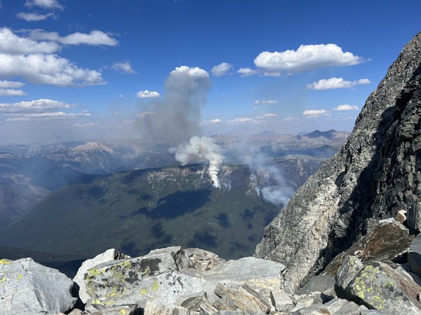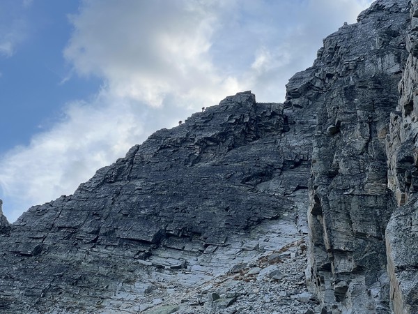 After about 5 simul pitches we came to a second class section where we could confidently unrope for a bit as the exposure had abated. This spot was where the west-face bypass descent route rejoined the ridge on the way down. After the second class ridge there was about 3 more simul pitches of climbing to the summit, which seemed to drag on forever as the summit looked so close. Finally we made it to the summit at about 1:30 pm, we still had maybe 7.5 hours of daylight so we felt pretty good about getting back to the car before dark. Little did we know how treacherous the descent would be. After some snacks we deliberated about how to get down. There were two options, either down-climb the whole ridge or take the west face bypass to avoid the steepest parts of the ridge. We decided that the west face bypass might be a better choice as it would be a bit quicker not having to down simul. While its true that a rope was not needed it wasn’t an easy to descent as we had to pick our way down cliff bands and be very sure-footed on the abundant loose scree. We made it back to the ridge and started looking for the rappel anchors as noted in the beta. The descent on the ridge proved pretty heinous in its own way. There were about 12 rappels interspersed with unknown lengths of down-climbing. The descent took much longer than the climb up as we had to look for anchors and switch back and forth between rappelling and down-climbing many times. About half way through ridge descent we got the rope stuck on a diagonal rappel. I had to climb back up and free the rope. Luckily we didn’t need to cut it free even though it really felt like we would for a while. This was a little sketchy since I didn’t have enough rope to lead back up the anchor. Once I climbed up a little bit I fixed the rope to a piece and tied catastrophe knots to myself to keep moving up without risking a deadly fall.