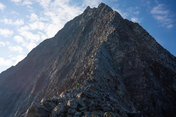 After another 1000ft of talus and scree hopping we made it onto the ridge where the climb starts. It immediately reminded me of climbing the north ridge of Tricouni peak near Squamish the summer before. I took the first lead, which ended up being a 500 ft simul pitch. On this pitch we were passed by a soloist. As he passed he seemed to be really struggling and unsure of the route finding. It also kind of disturbed me that he was wearing running shoes that looked like something you’d get at Big 5 and not something that would offer much confidence when climbing. Soon enough and he was out of sight and I didn’t have to spend much time worrying about him.