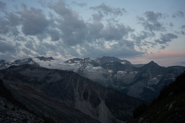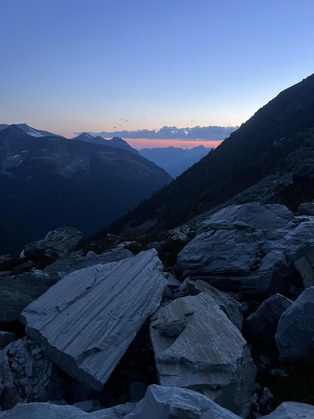 Once the alarms rang we drove to the trailhead, made some ramen, and set off into the forest. Walking through the dense forest at 2:30am was quite warm and humid, not something I was used to doing alpine starts in the sierra, where its always cool and dry in the night on all but the warmest of days. The hike went pretty quickly in the dark. Once we hit the lower bivy, about 3000ft above the trailhead, the sky started to get light and we saw a beautiful sunrise and got our first glimpse of the giant cirque we were in. We dropped our trekking poles and bear spray at the bivy and kept going.